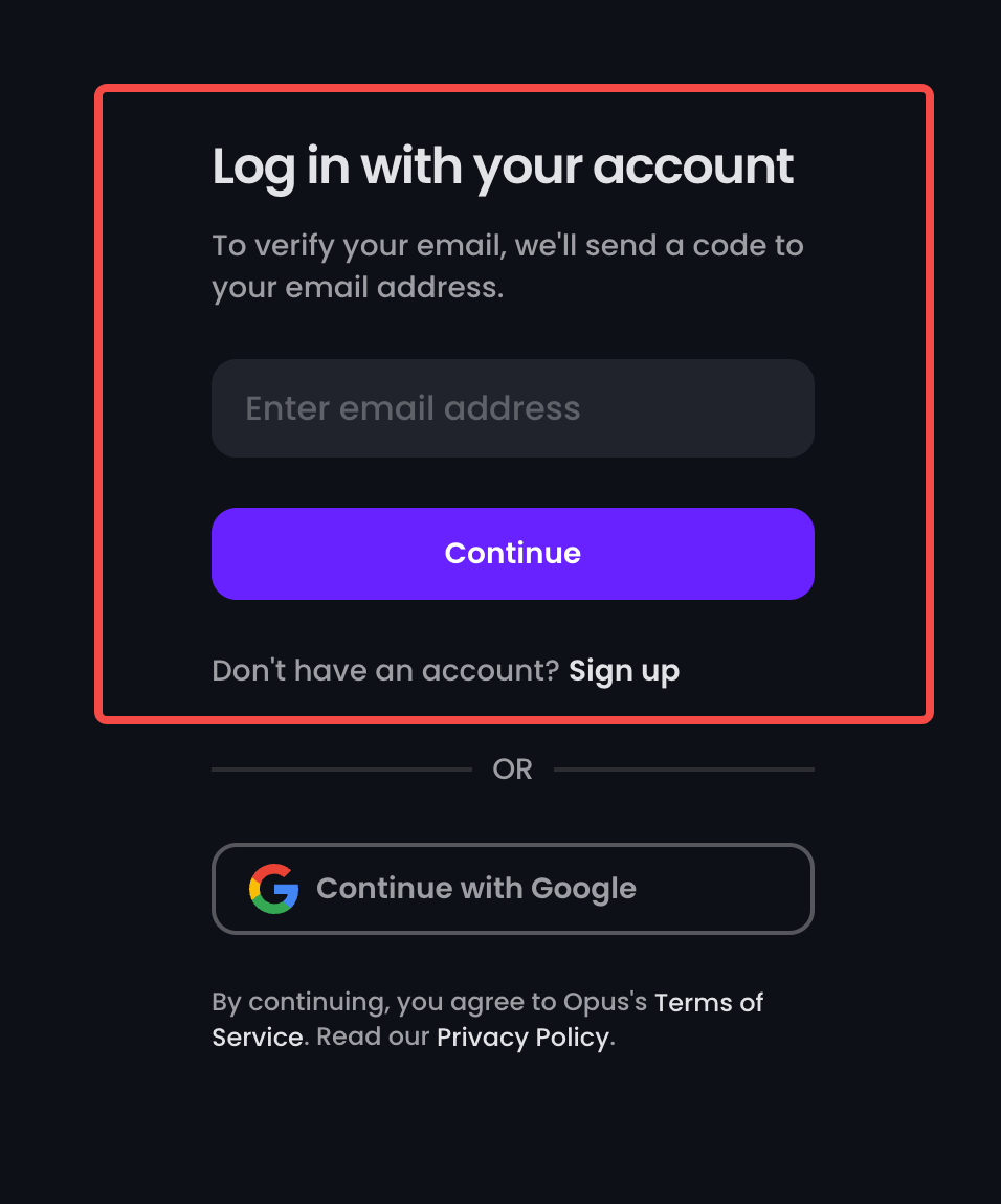 You can “Log out” first, then “Log in” on this page👇, you can use your email to login which doesn’t need your Google account password anymore. And your team members can use this email address to login with a verification code to access your Opus account.