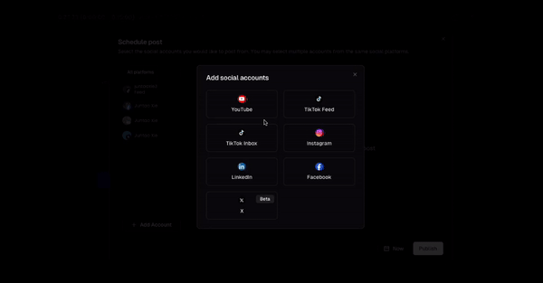 For Pro plan users, you can post real time posts to YouTube, TikTok, Instagram, LinkedIn, Facebook Page and X (Beta version). For Starter plan users, you can post real time posts to YouTube, TikTok and Instagram.Schedule future posts