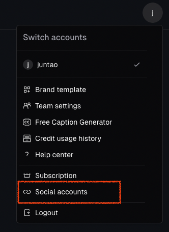 You can remove or add social account connections by selecting “Social accounts” in the dropdown menu. Note that your future posting schedules will be canceled once you remove your social connection. We will delete all your account information from our systems when you remove your account.