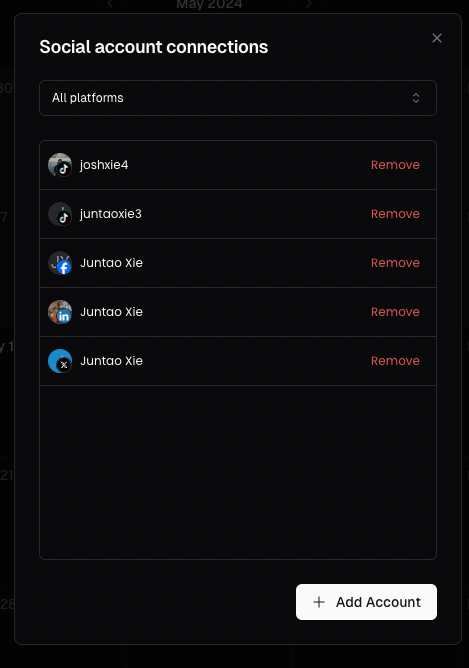 Our Pro plan users can connect multiple accounts to each social media platform. You can connect up to 6 social accounts as a Pro user. If you need to connect to more social accounts, please contact us. We might change this policy when we formally launch it. To add multiple accounts for one platform, simply choose “Add Accounts” and select that platform again.