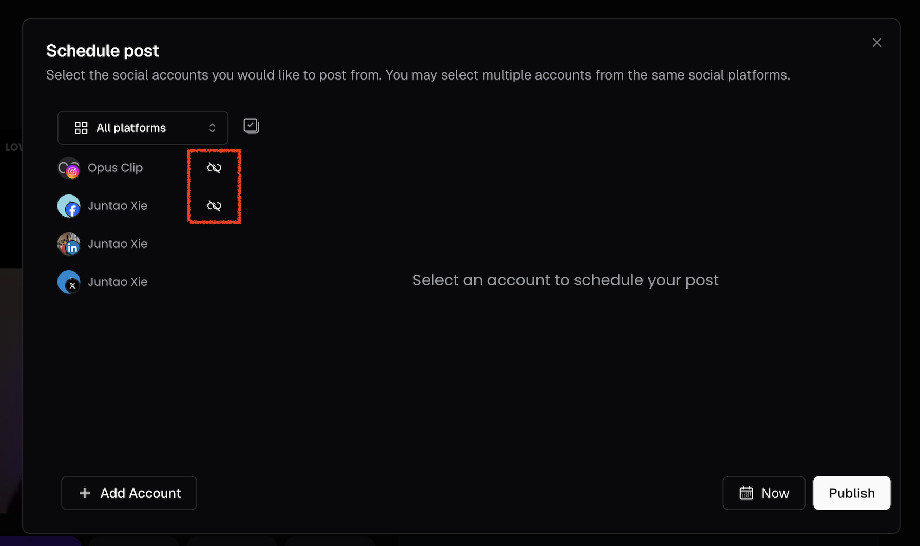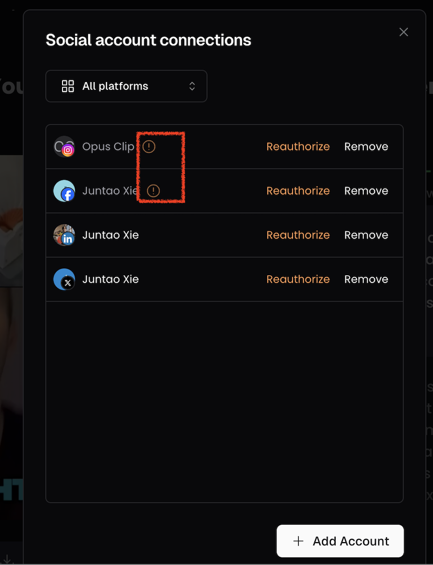 Your social accounts might sometimes get disconnected from OpusClip. This happens because we use APIs from social platforms like YouTube, Instagram, and TikTok to post clips to your accounts. As a security measure, these platforms periodically require you to reconnect your account to OpusClip. If you don’t reauthorize your social accounts, you won’t be able to post your clips through OpusClip.- This issue is most common with Instagram and Facebook.