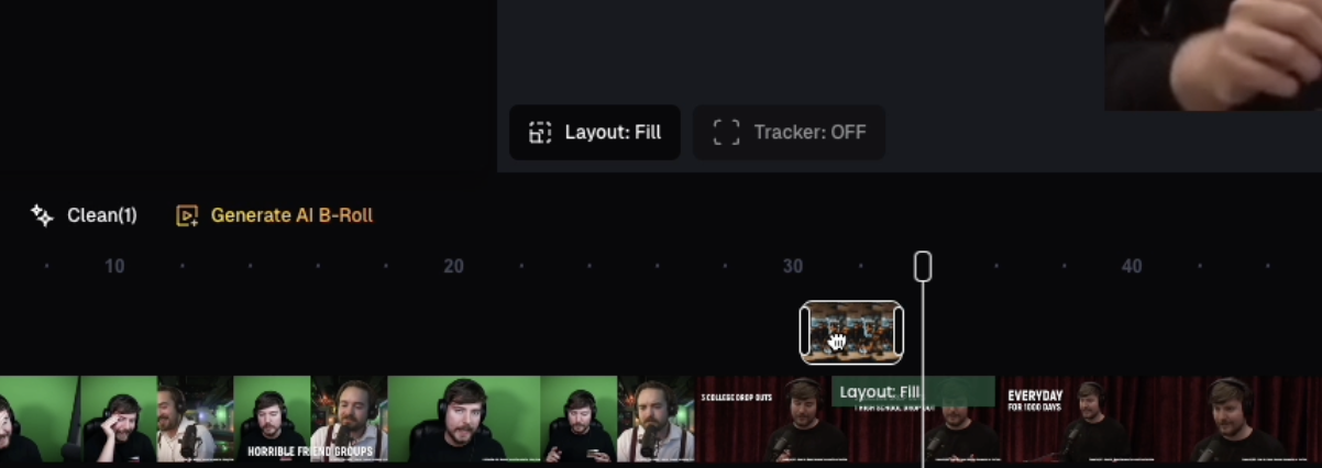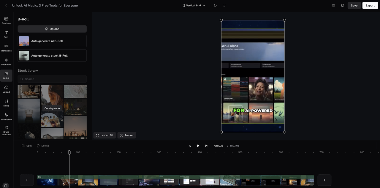 Our AI automatically adds contextually relevant B-Roll to your clips. To add AI B-Roll:- Go to the sidebar and locate B-Roll