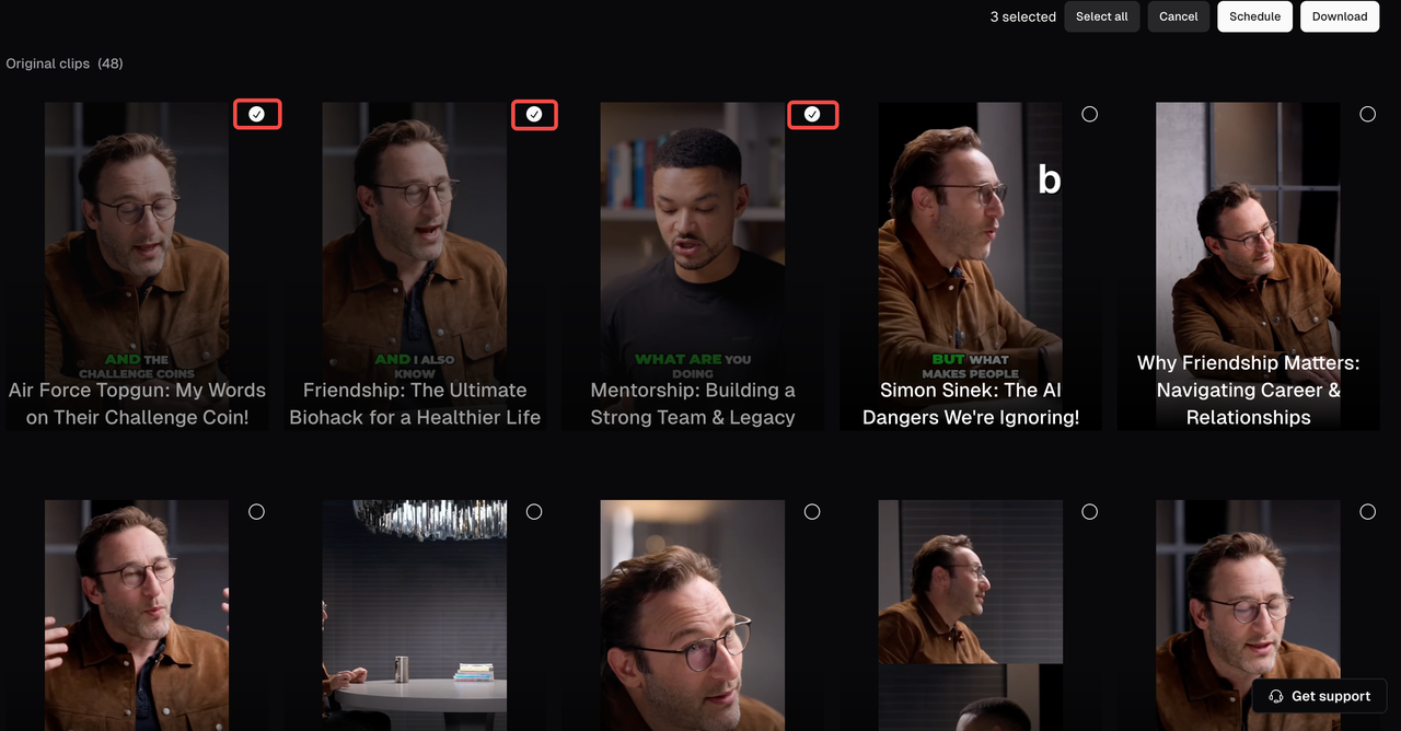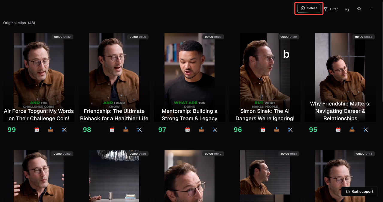 - Check the box next to each clip to make your selection or use Select all to choose all clips at once.