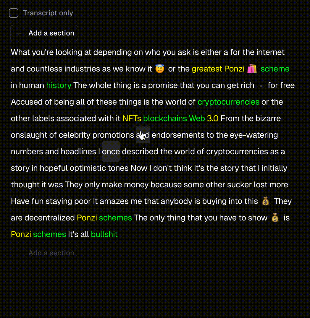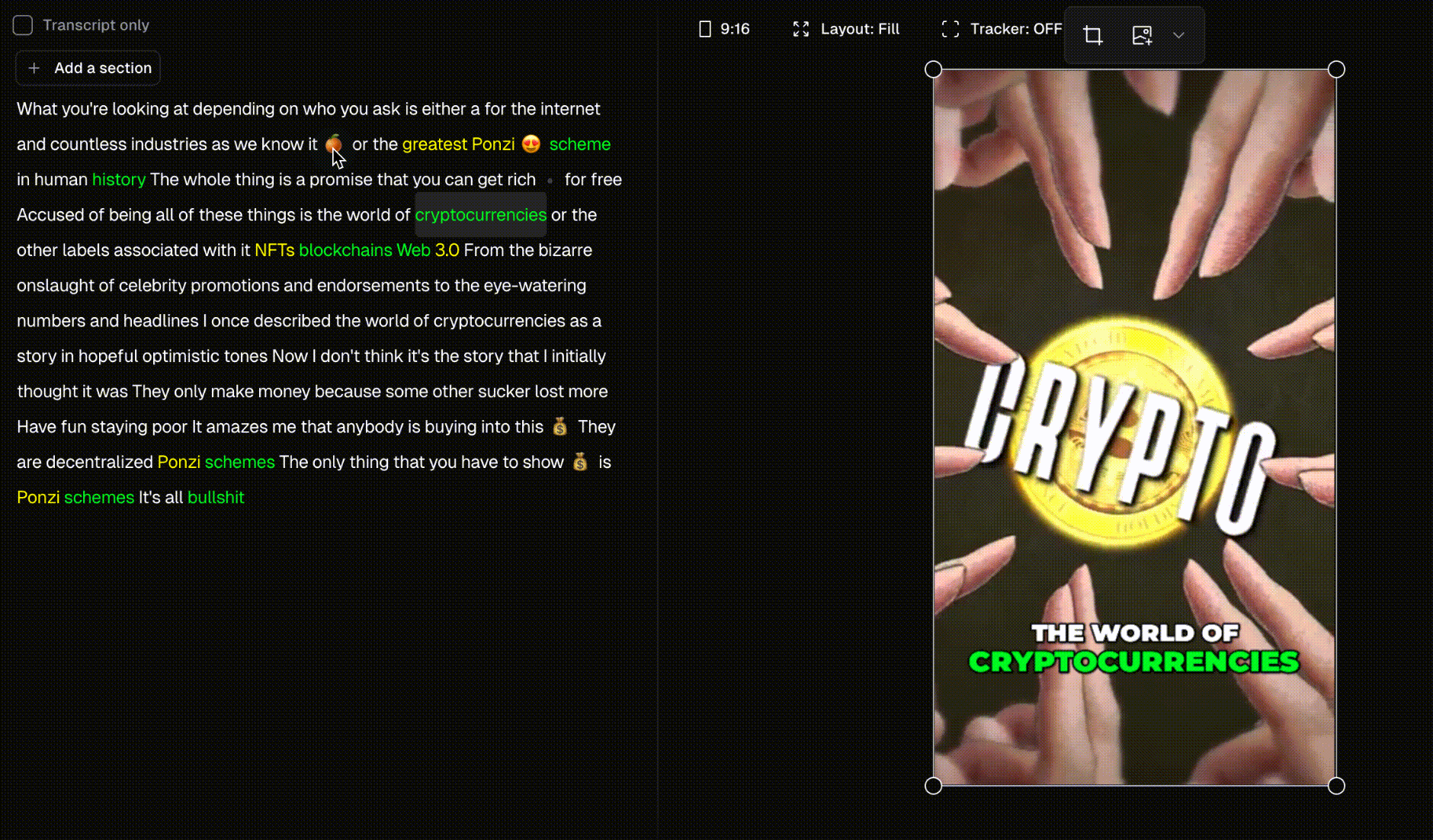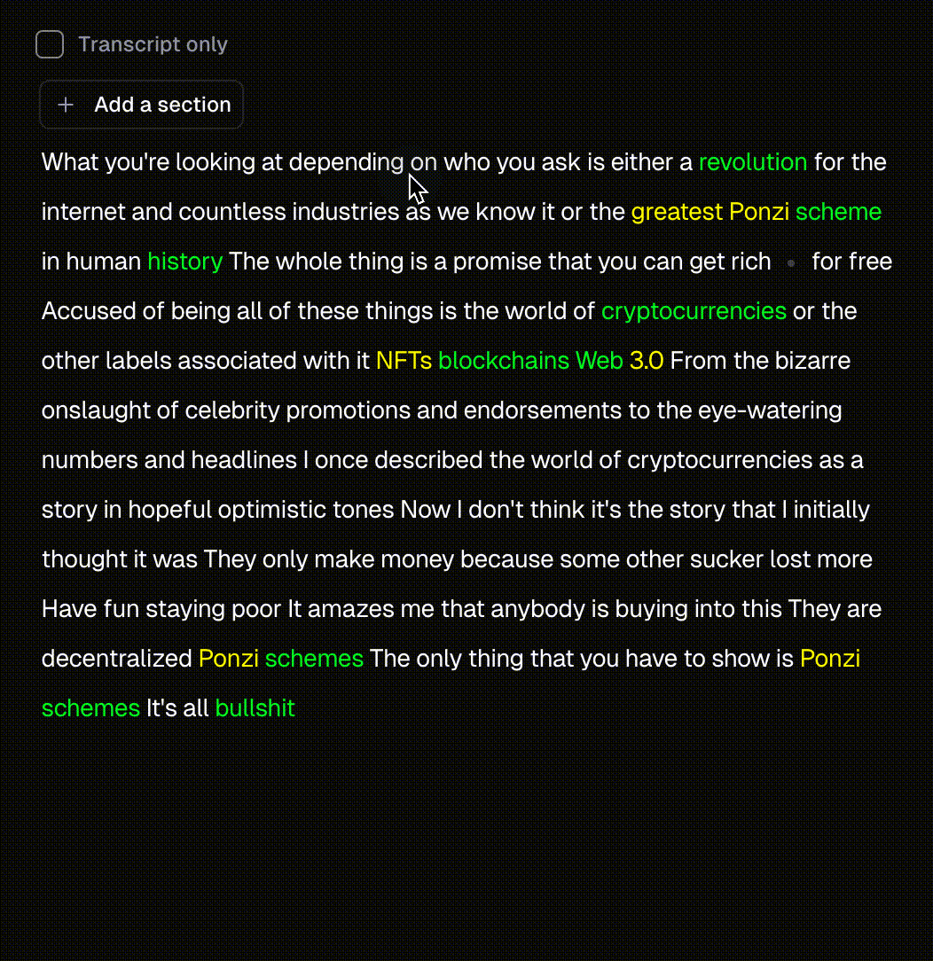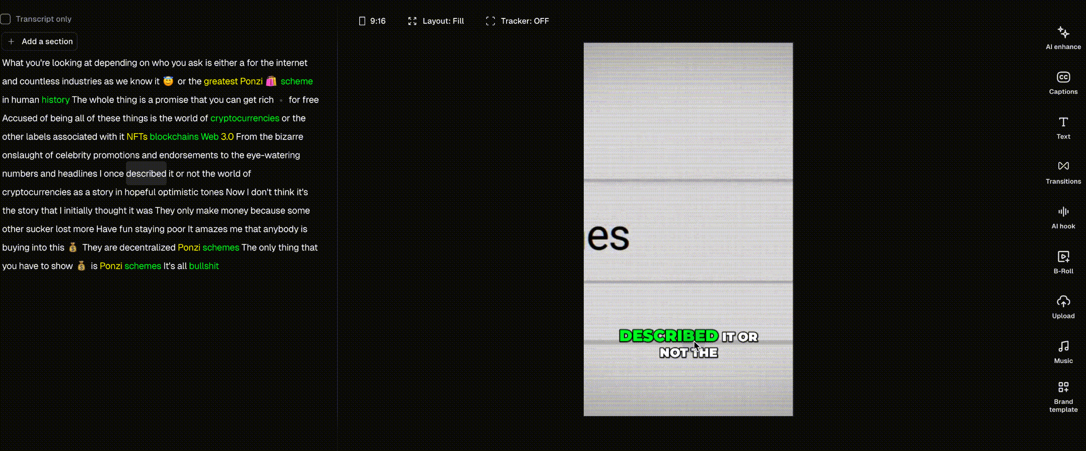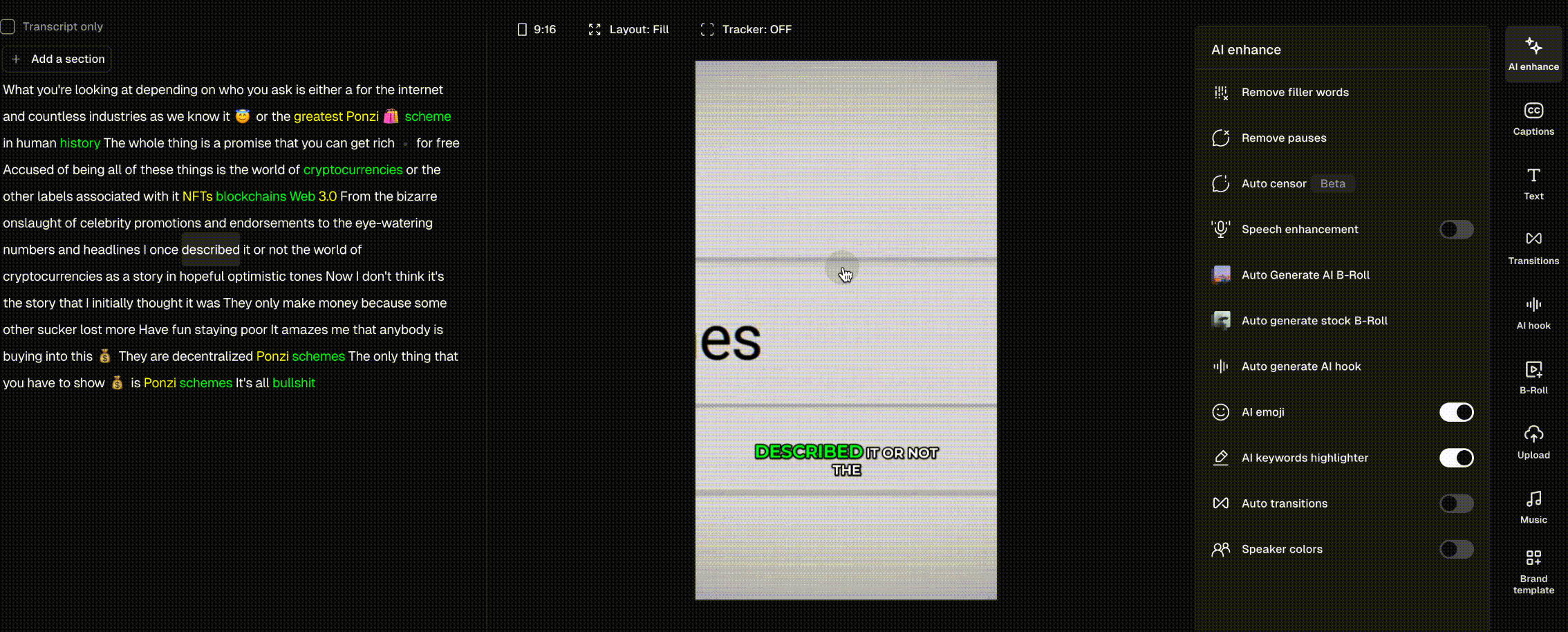 Absolutely! You can select multiple words, phrases, and even entire sentences at once. Simply click into the editing box to correct and make changes to them. You have the option to correct, remove captions only, or delete both the captions and the video for the selected words.How to trim or remove unwanted sentences from clips?