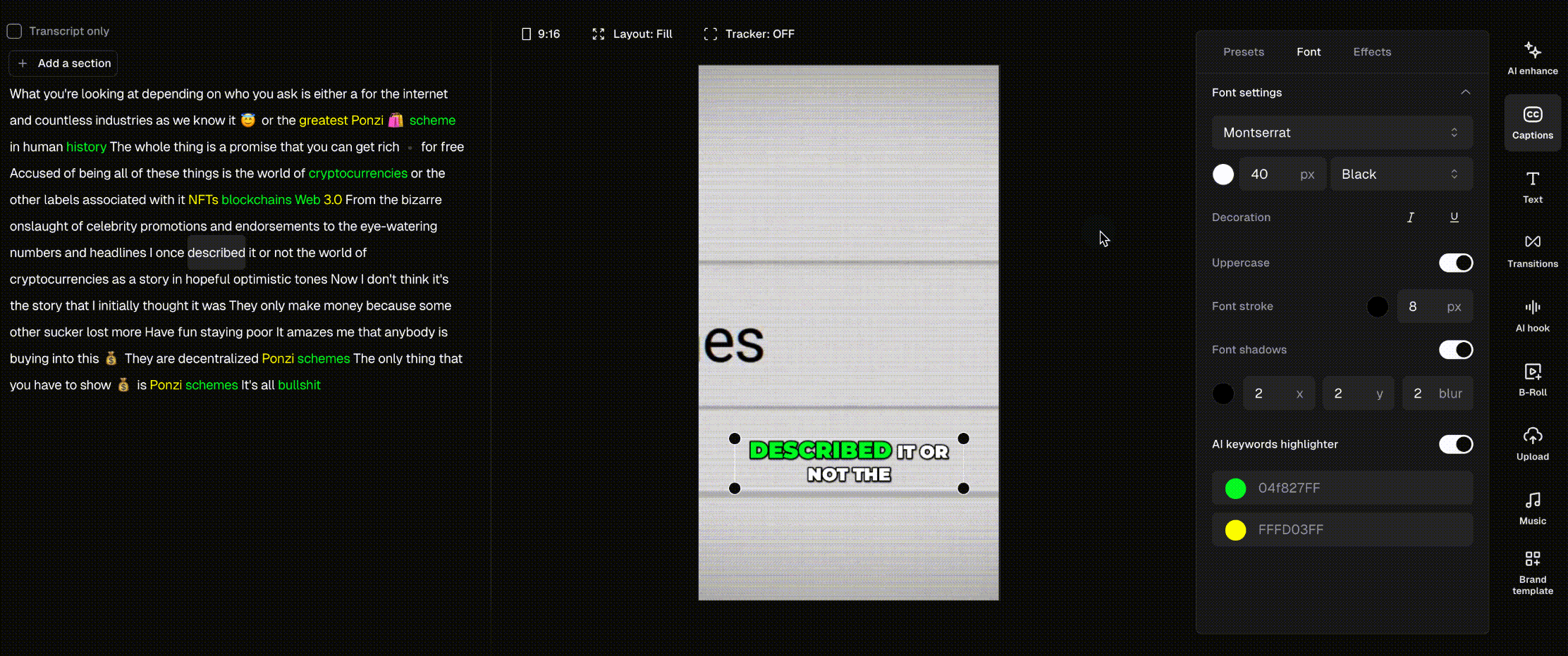 Yes you can! To do so, go to the right sidebar, and then click the “Captions” tab where you can find the fonts section. You can change font style, size, color, stroke, shadow, and case.