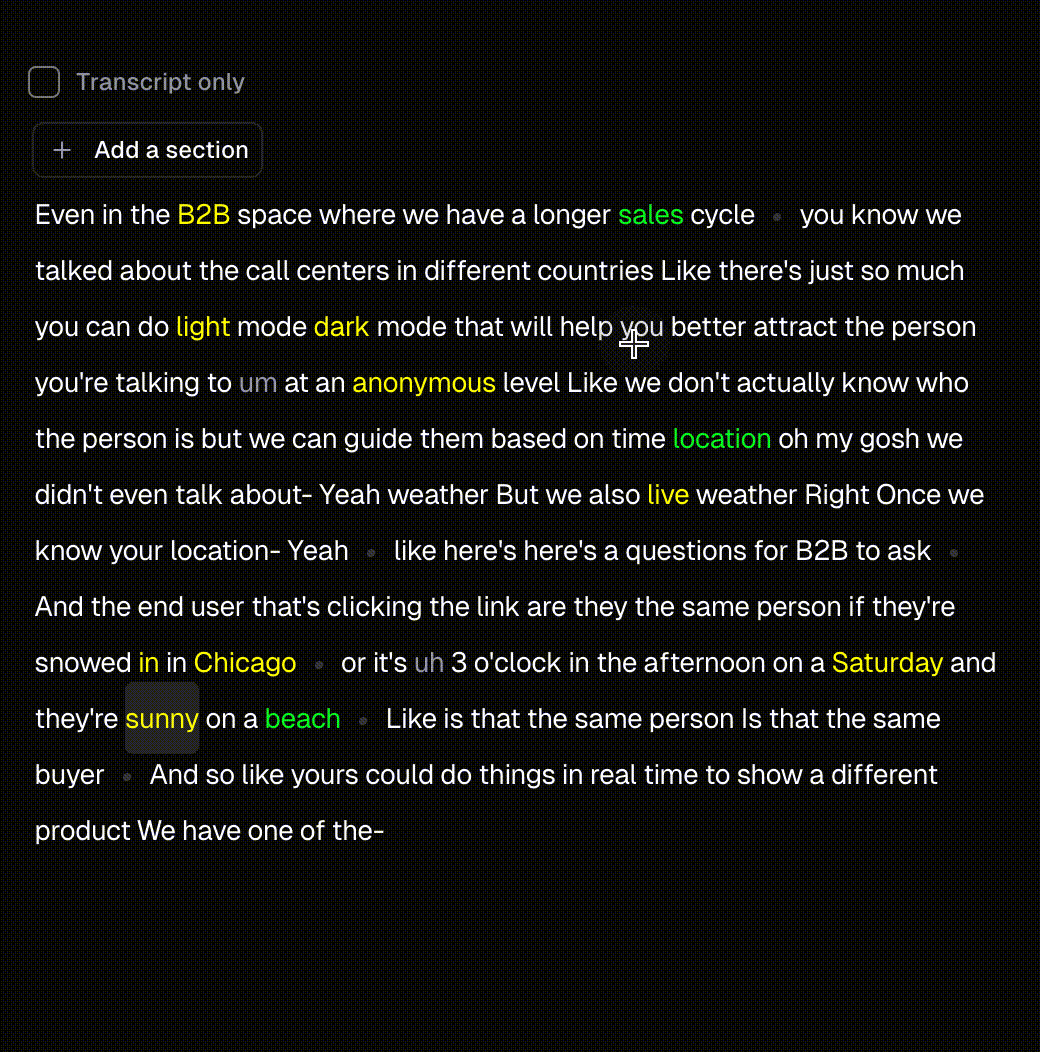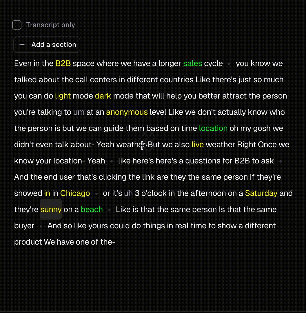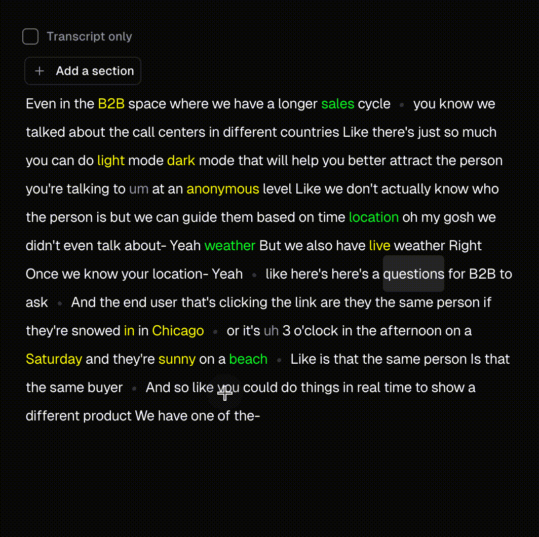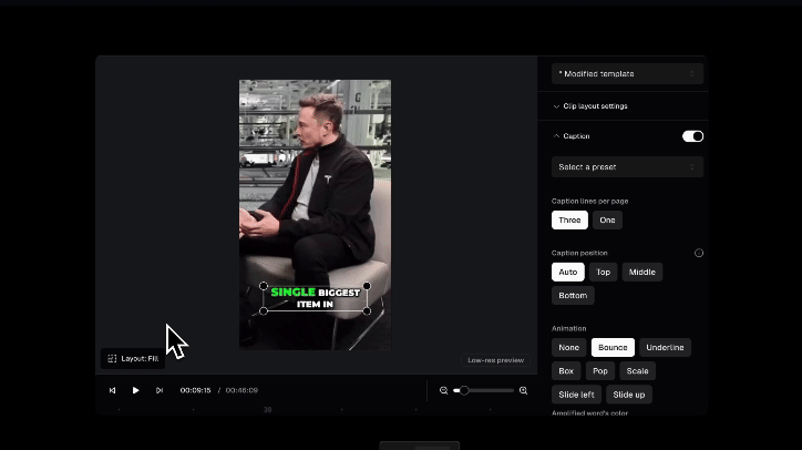 To refine your hook, extend your clip, or add a section from another part of your video, click Add a Section at the start or end of the transcript. Then, select the desired section from the full transcript and click Add.How to turn off captions?