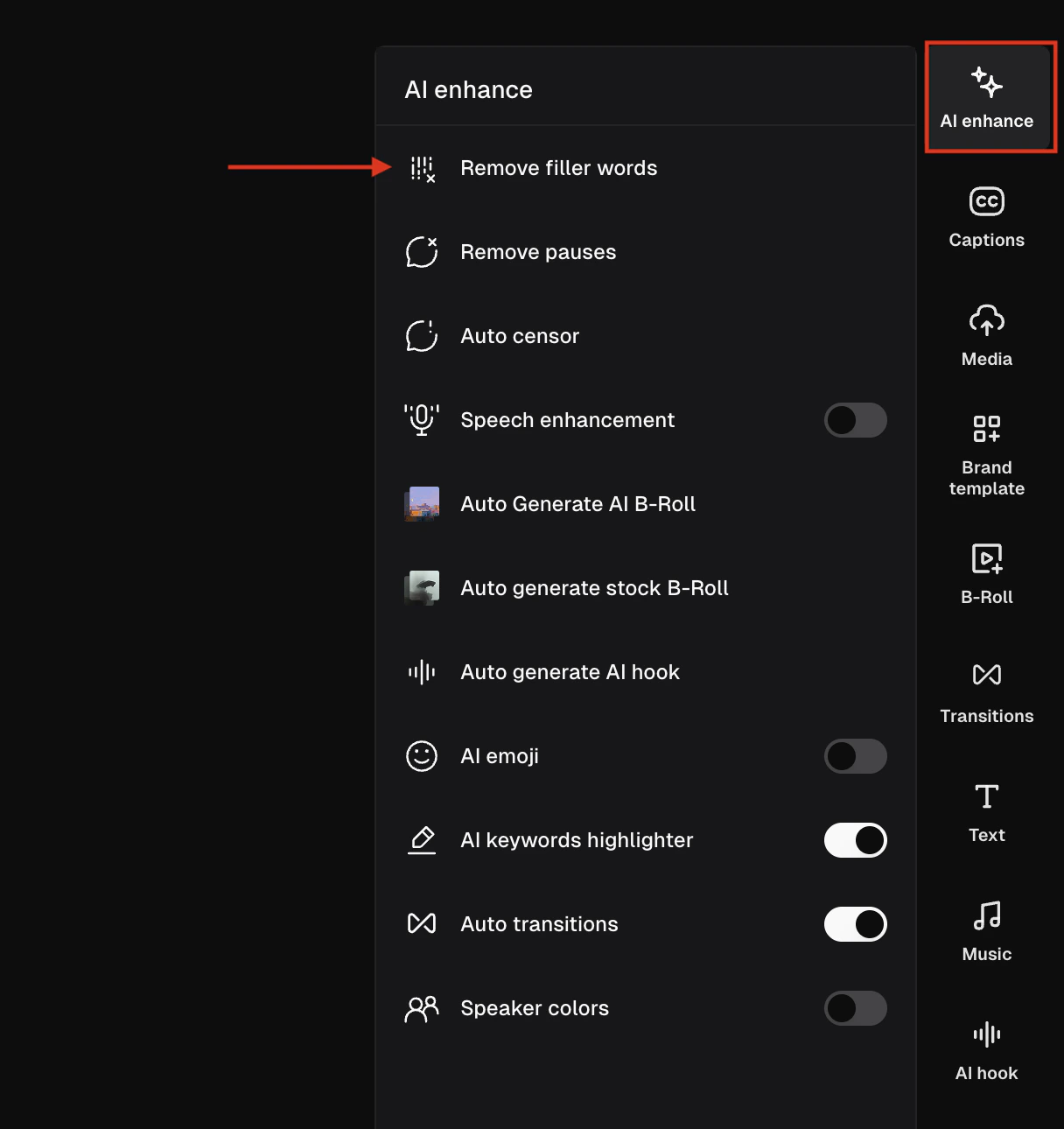 Our AI will automatically detect pauses and filler words in the clip. To remove filler words and/or pauses, click AI Enhance on the right sidebar and then select Remove filler words or Remove pauses.