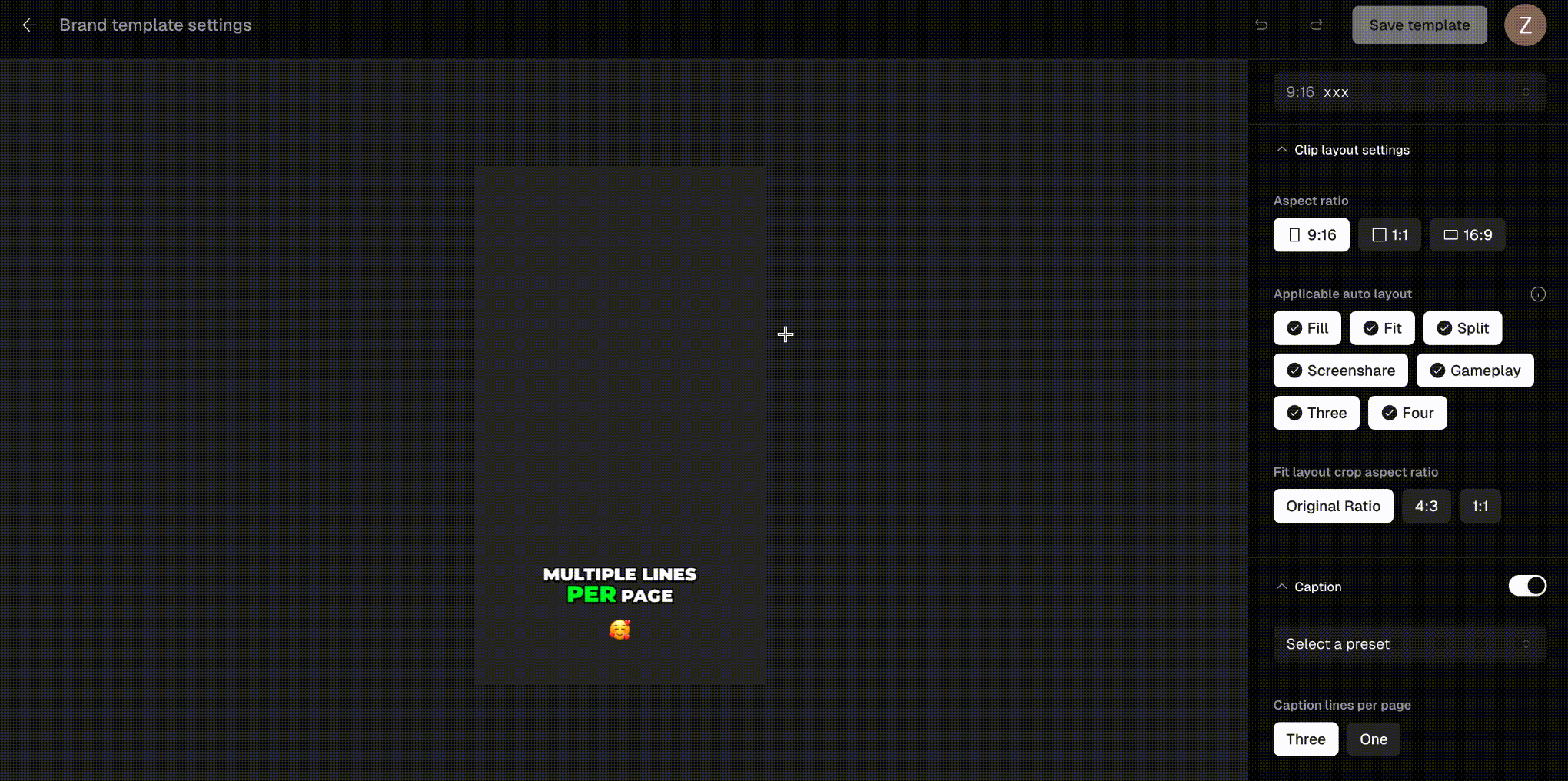 - Aspect Ratio: Brand templates allow you to preset a specific aspect ratio ahead of time and apply it to your clips with a single click. We currently offer 9:16 (Portrait), 1:1 (Square), and 16:9 (Landscape) aspect ratios.