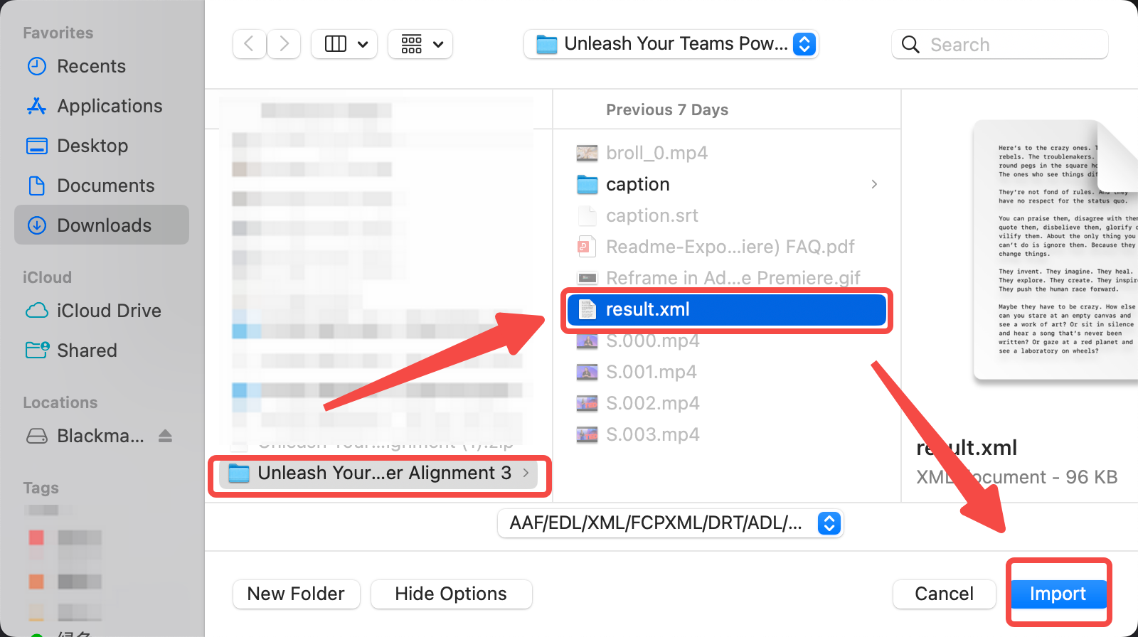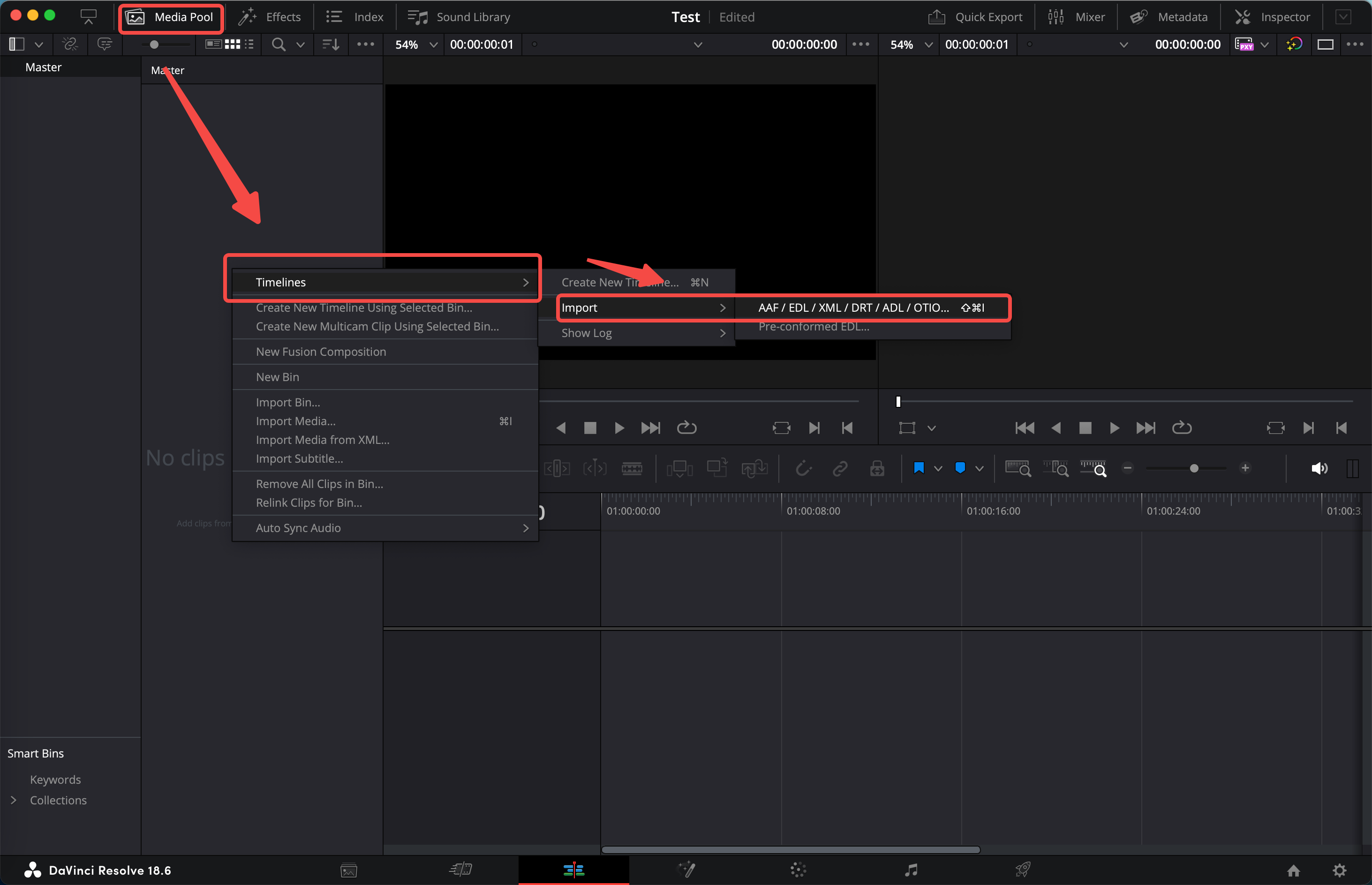 - Double click on the Media Pool area and select “Import AAF, EDL, XML…”