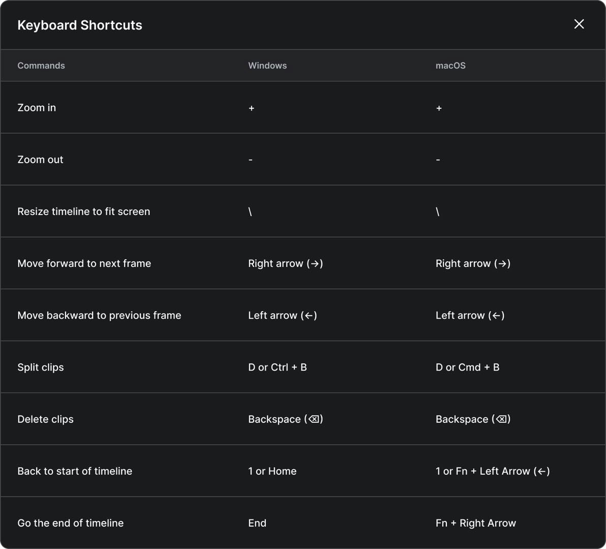 Keyboard Precise Editing opens up a world of possibilities for a quicker, smoother editing experience. It’s perfect for users looking to save time on repetitive tasks, such as splitting or deleting clips, and for those who want precise control over timeline navigation and playback.What are the keyboard shortcuts available?