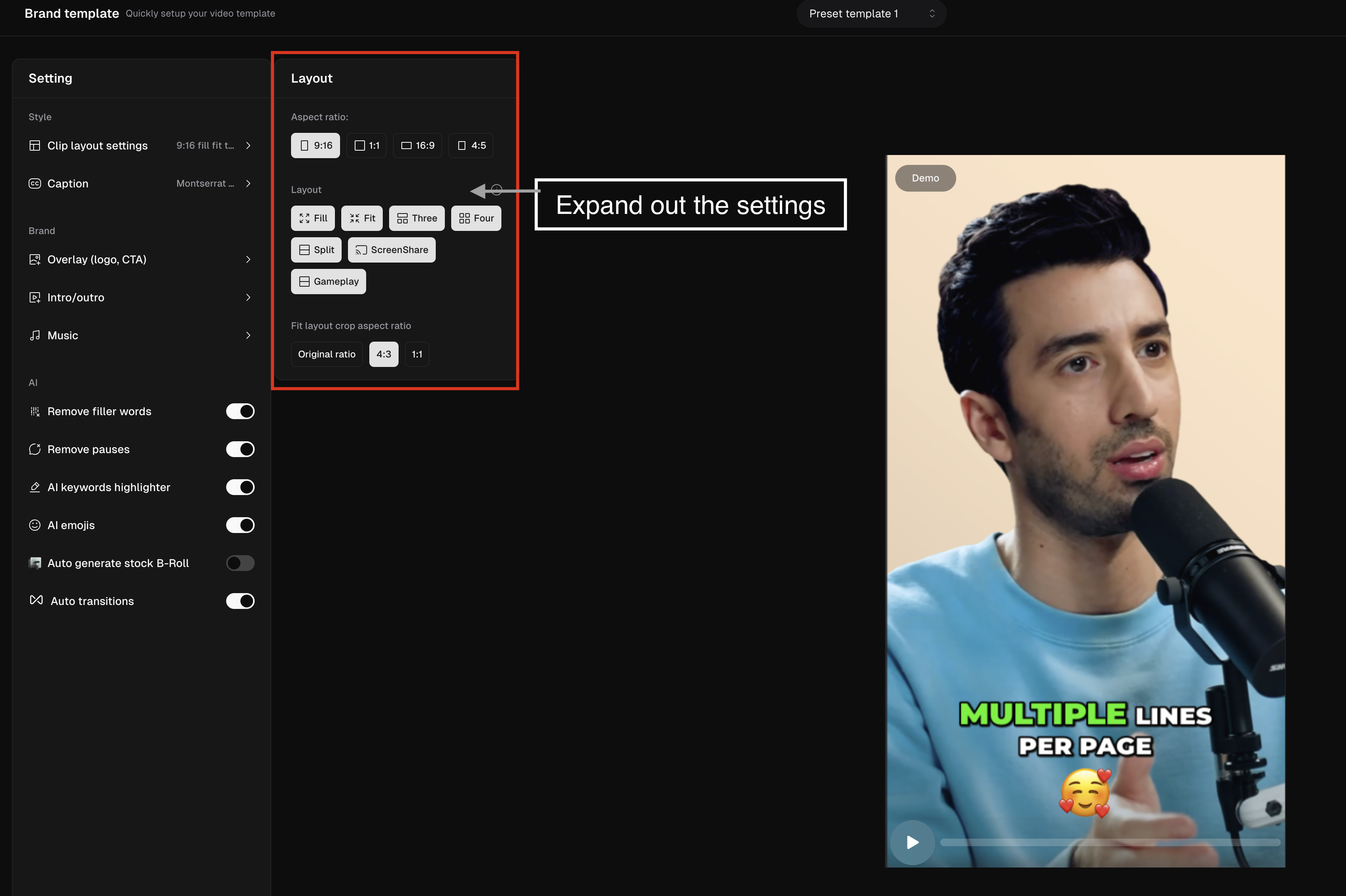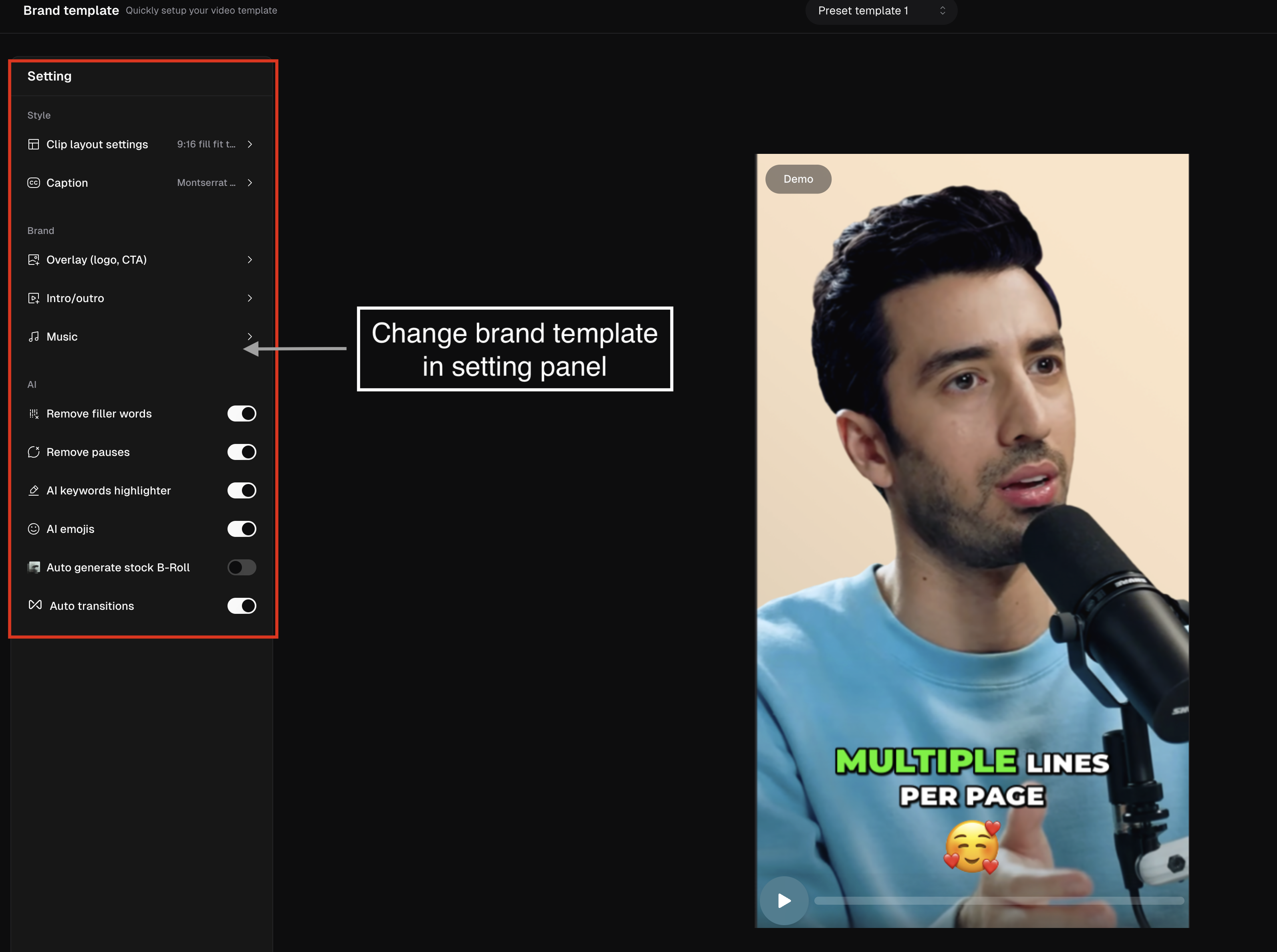 Brand template is a place where you can set up your branding preferences and apply them to all of your clips. To set up your brand template, click the icon below the house icon or visit here. On the Brand Template page, you can set up your preferences. Free and Starter users can set up 1 brand template, and Pro users are able to set up 2 brand templates.