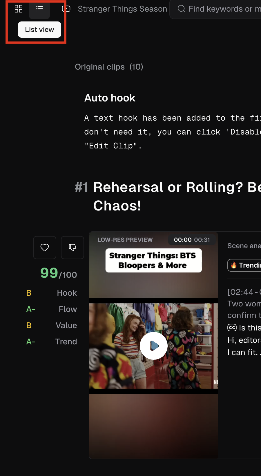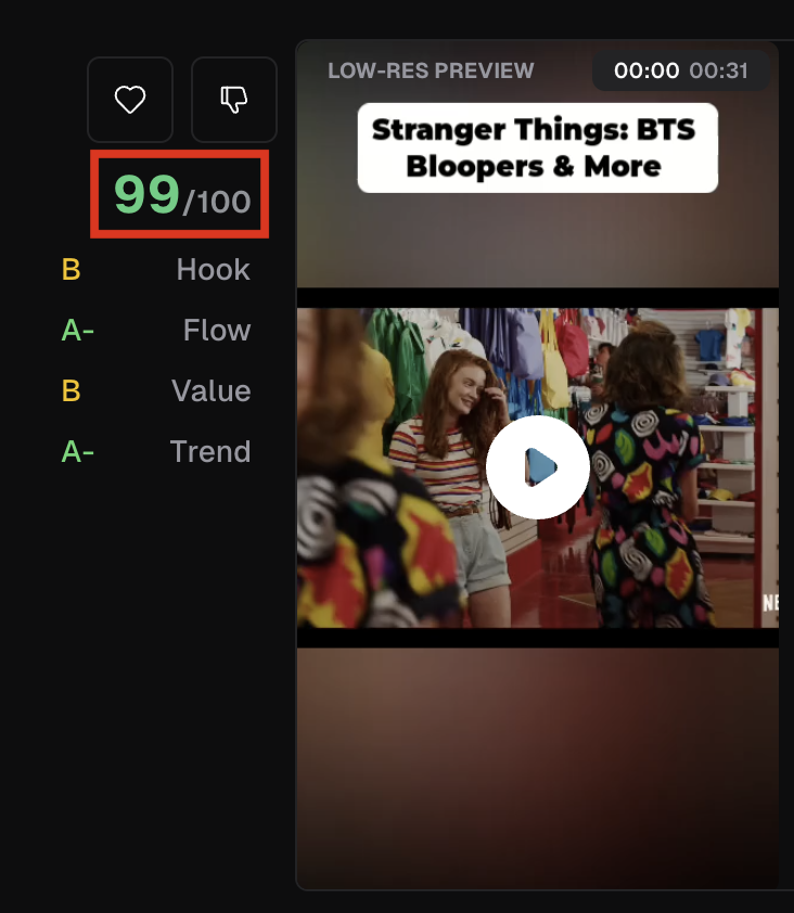 For users on Pro and Starter plans, our advanced AI analyzes your clips and assigns Virality Scores based on how likely each clip is to go viral. You can find the Virality Score next to your clips, depending on the layout you use to view your clips.